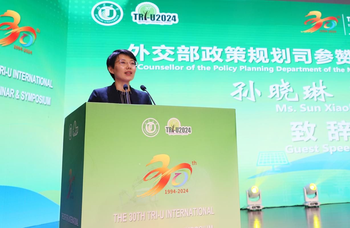 孙晓琳在致辞时说,走过三十年风雨历程的“三国三校”国际学术研讨会不仅是一个学术交流的平台,更是增进各国青年学者间理解和友谊的重要纽带。三十年来,数以千计的青年才俊从这里启航,在科学研究、技术创新和文化交流等领域为推动地区合作与全球发展作出了积极贡献。她表示,青年作为最具活力和创造力的群体,是应对全球性挑战、推动可持续发展的重要力量。她期待各位青年学者抓住此次研讨会的机会,以宽广的国际视野,共同探讨当前全球问题,分享真知灼见,激发创新思维,为地区和全球未来发展贡献智慧与力量。