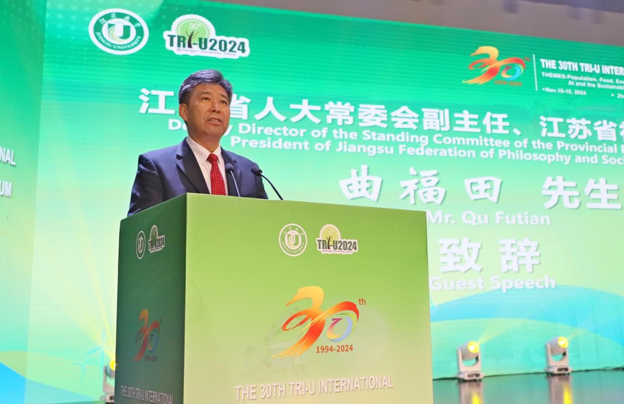 曲福田代表江苏省社会科学界联合会对本次研讨会召开表示祝贺。他在致辞中表示,“三国三校”国际学术研讨会举办三十年来,见证了中国江苏与日本、泰国、印度尼西亚等亚洲及东盟国家之间的学术交流、文化交融与深厚友谊,不仅成为思想碰撞的平台,更是增进区域友谊、深化合作的重要桥梁。曲福田希望大家持续深化学术议题,不断拓宽合作领域,涵盖更多全球关注的前沿课题,为学术界贡献有价值的研究成果;期待平台更加贴近现实需求,吸引更多青年才俊参与,成为亚洲各国思想交汇的智库,为共同应对全球经济、社会、文化等重大议题贡献亚洲智慧;期待通过这一平台,进一步拓宽国际产学合作渠道,推动学术研究与产业国际化发展深度融合。他表示,江苏省社科联将全力支持“三国三校”国际学术研讨会发展,期待为推动亚洲各国民心相通、共同发展贡献江苏力量。